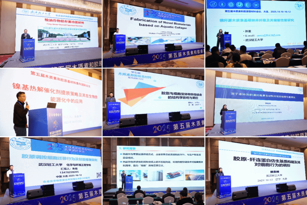 2025年10月10日至12日,2025第五届木质素和胶原基材料青年国际会议在大连举行。会议由大连工业大学、四川大学、齐鲁工业大学(山东省科学院)、广西大学、陕西科技大学、武汉轻工大学联合主办,《Journal of Bioresources and Bioproducts》、中国造纸杂志社、制革清洁技术国家工程实验室、广西清洁化制浆造纸与污染控制重点实验室、绿色造纸与资源循环全国重点实验室、农业废弃物资源化利用湖北省重点实验室、辽宁省制浆造纸工程实验室、辽宁省生物质化学与材料重点实验室、辽宁省木质纤维生物质精炼协同创新中心、中国轻工业植物资源高值化利用重点实验室、武汉轻工大学化学与环境工程学院、大连工业大学轻工与化学工程学院联合承办。本次会议旨在为全球从事木质素和胶原基材料研究的青年科学家及优秀研究生搭建一个高水平的国际化学术交流与合作平台。来自50余所高校、研究院所和相关企业,近500名专家学者、科研人员、企业代表及行业媒体共同探讨木质素和胶原基材料行业前沿动态、技术难点与未来发展方向。