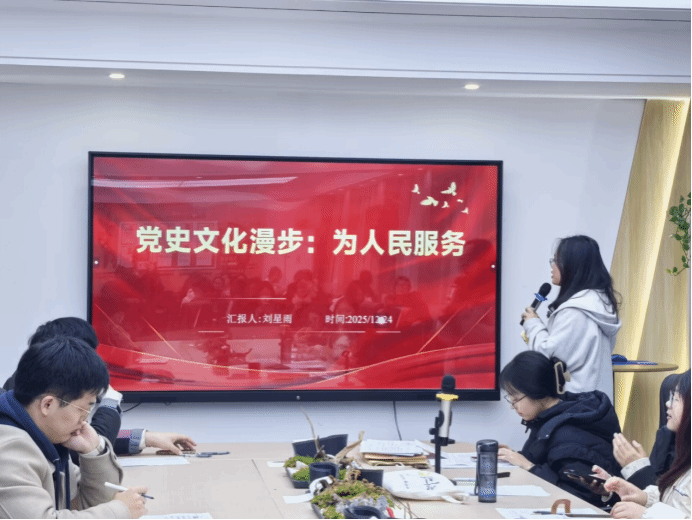 随后,“党史文化漫步”环节温情启幕。入党积极分子刘星雨以“党史文化漫步:为人民服务”为主题,图文并茂地带大家重温党的根本宗旨。她从“为人民服务”的提出背景、历史演进入手,结合党史经典故事与新时代先进案例,诠释其深刻内涵与时代传承。刘星雨说,这不是空洞口号,而是共产党人的价值追求,无数先辈用行动践行承诺。作为入党积极分子,要从党史中汲取力量,树立“以人民为中心”理念,在日常生活中关心他人、服务群众,以实际行动向党组织靠拢。