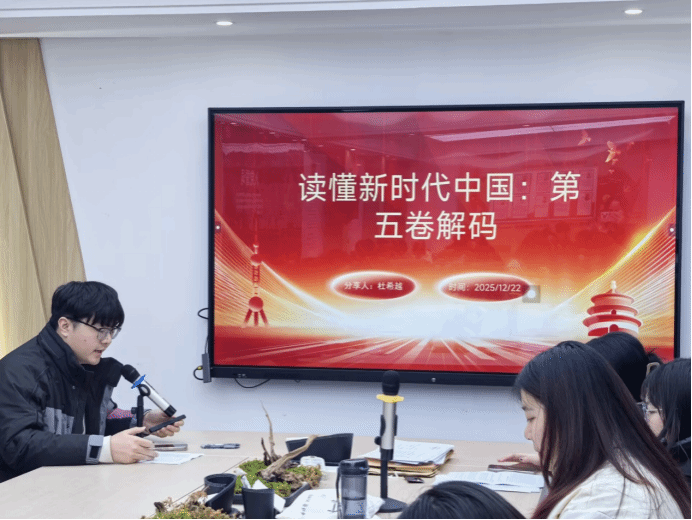 政治理论学习环节中,学生党员杜希越以“读懂新时代中国:《习近平著作选读》第五卷解码”为题,带领大家学习党的创新理论。他围绕著作的编纂背景、核心要义与时代价值,结合实际案例,解读了治国理政、改革发展、民生保障等重要论述。杜希越提到,这部著作是新时代党的创新理论结晶,是党员提升能力的重要教材,号召大家把学习纳入日常,读原著、学原文、悟原理,掌握其中的立场观点方法,把学习成果转化为工作实效,为高质量发展筑牢思想根基。