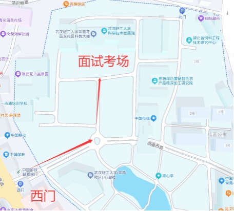 交通指引:笔试和面试地点均导航至:武汉轻工大学常青校区西门(如下图指引)