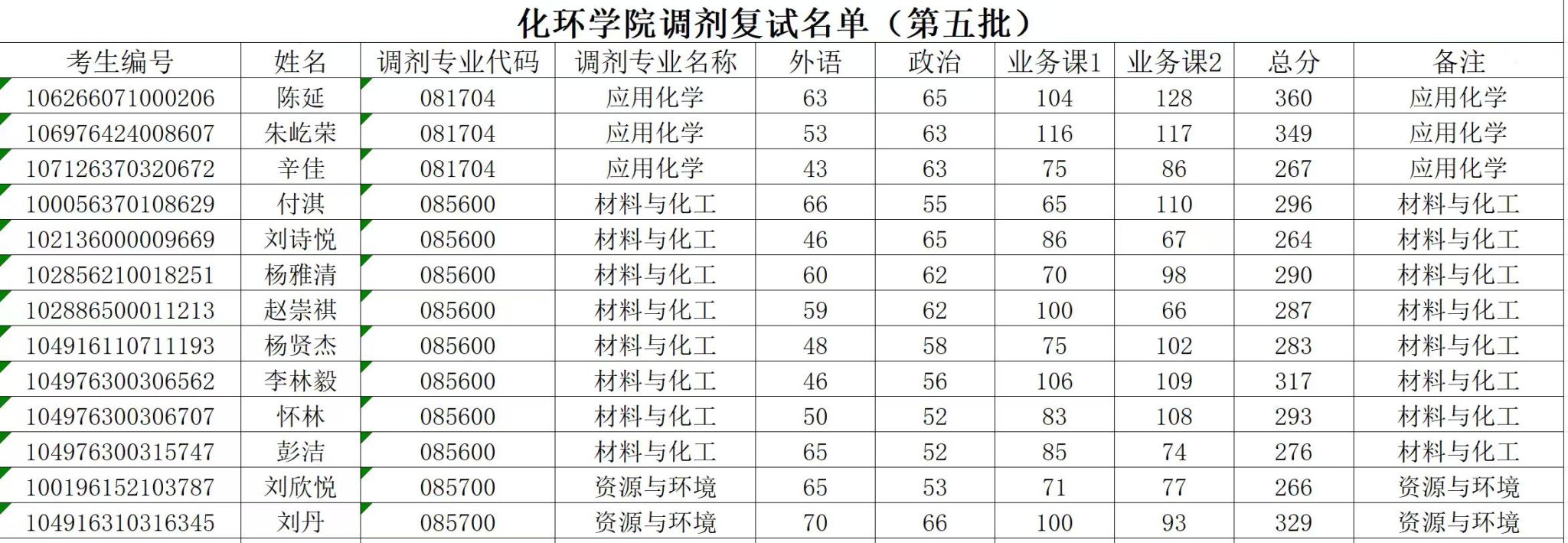 2026年化环学院调剂复试名单(第五批)