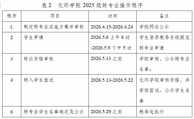 化学与环境工程学院2025级本科生一年级下学期转专业实施方案