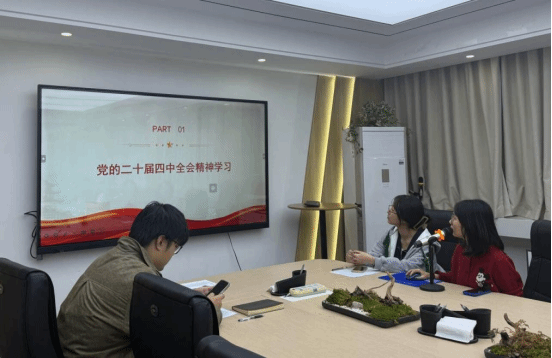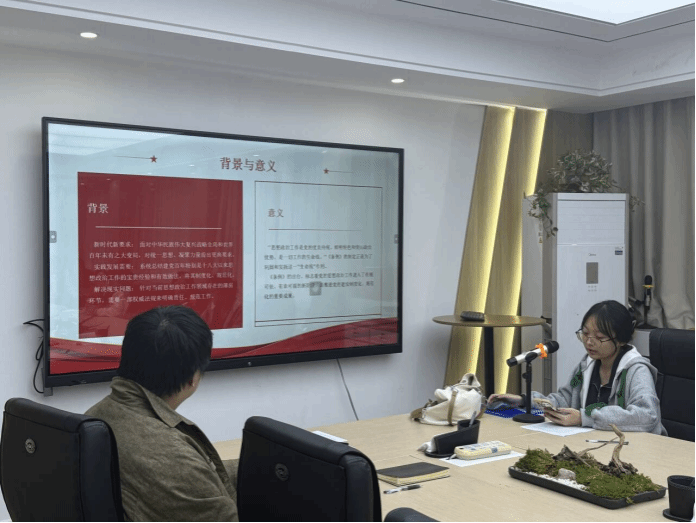 紧接着由党员熊子怡学习分享了党的二十届四中全会精神。她从全会精神核心要点到重点领域战略部署,从习近平总书记重要讲话精神到高校自主创新驱动发展;同时结合自身工作实际,联系到学校推出的“轻工优选”品牌,进一步说明了校企双方在科研、人才技术等方面对学生的培养。她总结到在座研究生都要深悟党的二十届四中全会精神精髓,以党建为引领推动学术科研与思想政治工作深度融合,在日常学习工作中发挥先锋模范作用,以实际行动助力学校高质量发展、共筑中国梦。