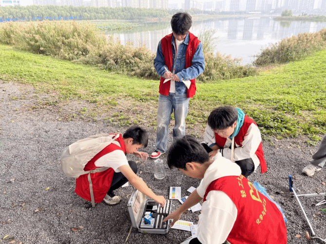 随后,志愿者团队按照既定安排前往指定取样地点进行水质检测。抵达后,他们遵循标准化操作流程,规范采集水样,以保证样本的代表性与准确性。紧接着,志愿者们对水样的酸碱度、生物活性、重金属含量等多项指标开展精确检测,为后续水质评估与分析提供可靠数据。各项工作完成后,志愿者们手持化学与环境工程学院旗帜合影留念。