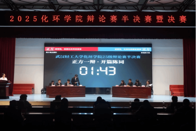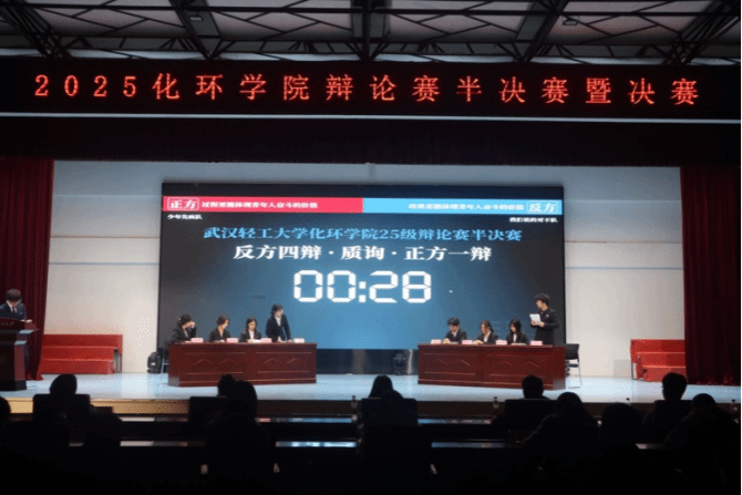 为了提高学生的口才及逻辑思维能力,丰富校园文化生活,促进同学间的沟通与合作,11月25日,武汉轻工大学化学与环境工程学院在常青校区大学生活动中心举办了以“弘思辨之尚,展青春之风”为主题的2025年辩论赛半决赛暨决赛,化环学院党委书记于雪、化环学院党委副书记黎操书、化环学院分团委书记李妍老师以及全体大一新生到场观赛。